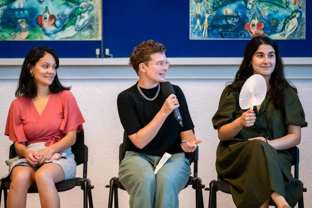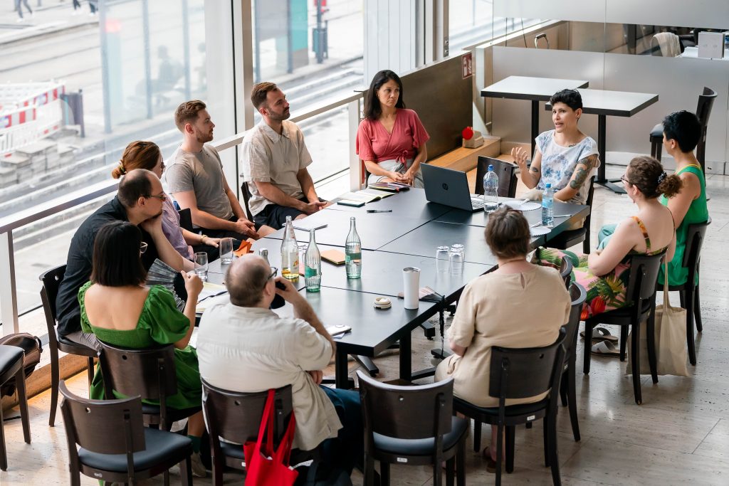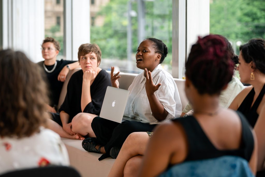 In a panel discussion, Chiaki Soma, Mike van Graan, and Nora Amin—moderated by Melmun Bajarchuu—discuss the role of conflict in transformative processes. In two sessions featuring a total of seven roundtables, Alexandra Diaz Loo, Carole Karemera, Carolina Mendonça, Ferdaouss Adda, Gerald Odil, Koleka Putuma, and Tessa Hart share perspectives, questions, and methods of transformation and care.